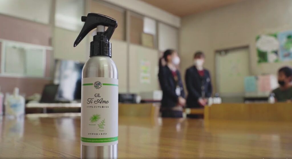 商品名は「ジーエル・ティアモ」。最初のジーエルはコースの名前で、ティアモはイタリア語で「愛している」の意味。「どうしてイタリア語かというと、昨年夏にイタリア人留学生が来ていたのですが、新型コロナウイルスの影響で帰国することになってしまいました。その子を想い、また国境を越えて遠い場所でも愛される香りになるようにと願いを込めました」と、担当生徒。