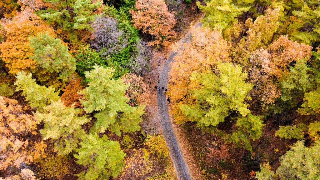 秋深まる11月中旬、黄金のグラデーションが美しい森へ。森の中は眩いばかりに黄葉する樹々に彩られていました。カサッカサッと落ち葉を踏む音が心地よく耳に響く中、「この森で何ができるだろう?」をテーマに、森の中を歩く伊那谷ツアーが行われました。
