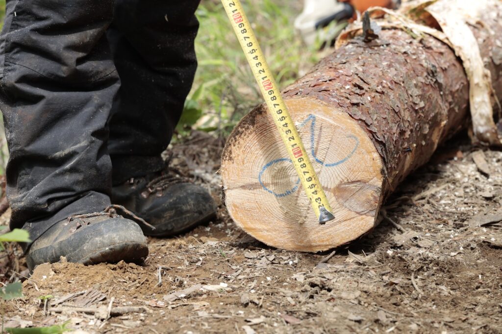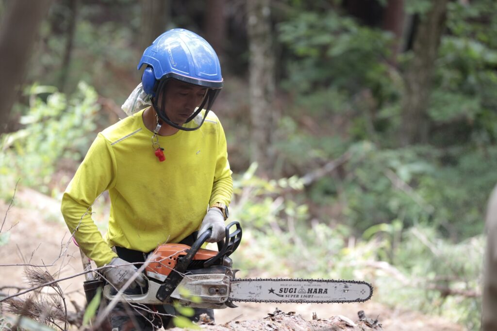 その後は、実際にグループに分かれて、木こりのサポートを受けながら1人1本チェーンソーで伐倒。休み時間には薪割りをしたり、重機に乗らせてもらったりと、密度の濃い1日でした。