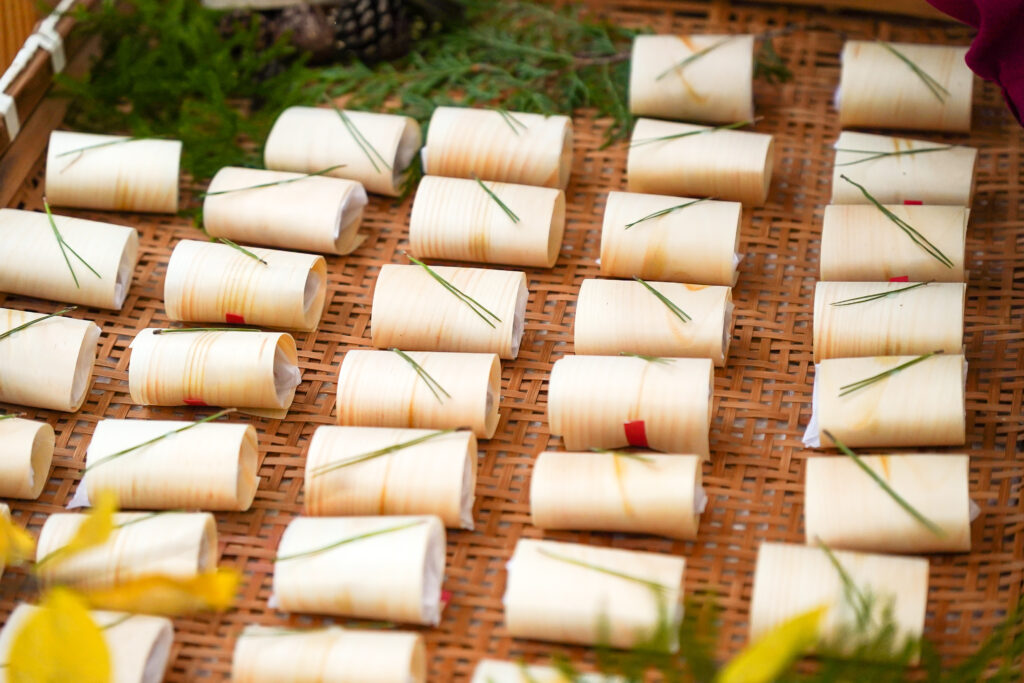 伊那市内でカンパーニュと焼き菓子を作っているえんむさんのクッキーを2種類、経木で包んで用意しました。受講生の中には、手作りのお菓子を作って持って来てくれた人もいてとても嬉しかったです。
